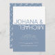 This enchanting wedding invitation showcases a delightful combination of dusty blue and white color blocks, creating a modern and whimsical aesthetic. The upper portion of the invite is elegantly adorned in a white hue, while the lower part features a dusty blue shade. Adding a touch of playfulness, the bride's name is elegantly inscribed in blue on the white block, while the groom's name stands out in white on the dusty blue block, intriguingly placed upside down. The invitation's minimalist charm is further enhanced by the use of a simple font. On the reverse side, a captivating pattern of the couple's initials in white gracefully adorns a dusty blue background, completing this captivating wedding invitation.