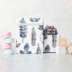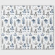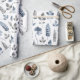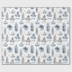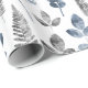 A blue and white modern floral wrapping paper featuring a pattern of fern leaves and florals in a subdued repeat pattern