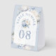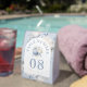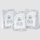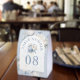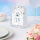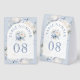 Elegant dusty blue wedding table card featuring beautiful flowers.