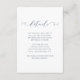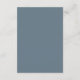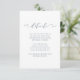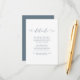Dusty blue and white wedding guest details card with beautiful calligraphy script.