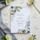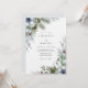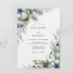This design features a cool-toned botanical arrangement perfect for a seasonal winter event. Delicate white anemones with dark centers are nestled among crisp pine needles and frosted eucalyptus foliage. Subtle crimson berries add a touch of warmth to the icy dusty blue and sage green palette, creating a sophisticated and ethereal aesthetic.