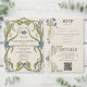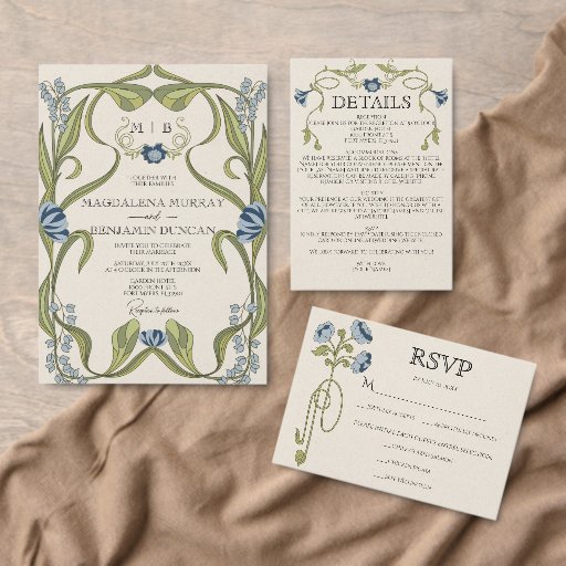 Romantic design with an Art Nouveau floral frame, in the colors of dusty blue and navy with muted greens on the background of vintage paper. Elegant, sophisticated vintage fonts complete the timeless and classy look.