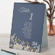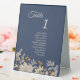 This Dusty Blue Autumn Boho wedding table tent sign with guests combines an antique vibe with a retro bohemian wildflower look. The elegant, neutral beige wildflowers on top of the dusty blue, navy background, with its classy calligraphy typography, allows for a formal but wild and floral, vintage style marriage celebration theme.