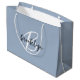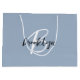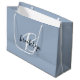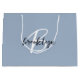 This personalised gift bag features a monogram and first name in modern black and white script on a trendy dusty blue background, with the additional text in black sans serif font below.