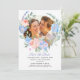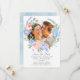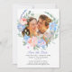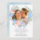Chic watercolor design features your couple's photo in a pretty floral wreath. Blush pink and pastel blue flowers give the wreath a modern and trendy vibe. Save the Date, the wedding couple names and wedding date follow. More information can be placed on the back. This Save the Date postcard is part of the Joyeux collection. It contains the DIY templates you need to create a wedding stationery suite.