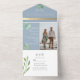This elegant dusty blue all-in-one wedding invitation combines boho botanical charm with modern minimalism. Featuring soft watercolor greenery and muted blue tones, it’s perfect for garden weddings, outdoor ceremonies, or minimalist celebrations. The foldable format includes built-in RSVP details for added convenience. Pair it with matching pieces from our dusty blue botanical collection to create a cohesive and sophisticated wedding suite.