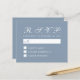 A simple, minimalist budget RSVP for a wedding. It has only white text on dusty blue background. The title RSVP and the letter M are written in an elegant calligraphic script, the rest in caps.