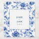 Elevate reception wines with this dusty blue chinoiserie square wedding bottle label, showcasing intricate floral borders around a crisp white center with couple's names and date in refined serif. Perfect for coastal, garden, or elegant affairs with its porcelain inspired charm. Seamlessly matches blue floral invitations and seals for unified "something blue" styling.