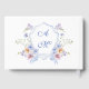 A refined and romantic wedding design featuring a dusty blue monogram crest framed by watercolor florals in pastel lavender, blush, and peach tones. The layout includes soft greenery, elegant serif and script typography, and a timeless format perfect for formal weddings.