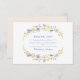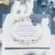 A refined and romantic wedding design featuring a dusty blue monogram crest framed by watercolor florals in pastel lavender, blush, and peach tones. The layout includes soft greenery, elegant serif and script typography, and a timeless format perfect for formal weddings.