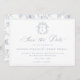 Dusty Blue Monogram Crest, wedding save the date. Vintage inspired Regency-Era baroque line art monogram crest. Features, an elegant dusty blue typography design style mix of script and bold type. Chinoiserie style garden pattern backing with QR code detail.