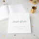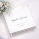 Elegant dusty blue wedding guest book featuring romantic calligraphy and refined serif typography. The minimalist design highlights the words “Guest Book” in graceful script, paired with the couple’s names, venue, and wedding date for a timeless and sophisticated look.