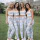 Celebrate the bride-to-be with a romantic English village wedding design in soft dusty blue tones. Hand-painted stone cottages, a traditional village church, floral garlands, teacups, wedding cakes, and a horse-drawn carriage repeat in a charming watercolor layout inspired by classic countryside celebrations. The calming dusty blue base is paired with cream, sage green, and warm neutrals, creating an elegant, nostalgic look perfect for bachelorette parties, bridal weekends, hen celebrations, and coordinated bride squad outfits.