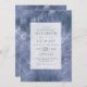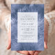 An elegant abstract design in shades of dusty blue and white, suggesting the feathery texture of frost or delicate foliage, provides the background for the charcoal grey text on a white rectangular screen. The dusty blue design is repeated on the back of the card.