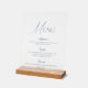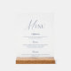 Printed on a modern clear acrylic panel and displayed on a wooden base, this menu combines classic calligraphy with minimalist luxury.