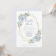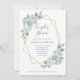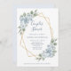 This simple and elegant couples wedding shower invitation features romantic watercolor eucalyptus leaves and dusty blue roses and hydrangea flowers on a faux gold geometric centre frame and a white background.