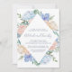 This dusty blue floral diamond engagement party invitation card is perfect for a spring or summer event. The dainty design features light blue peonies arranged with peach and cream flowers in a gorgeous diamond shaped wreath.