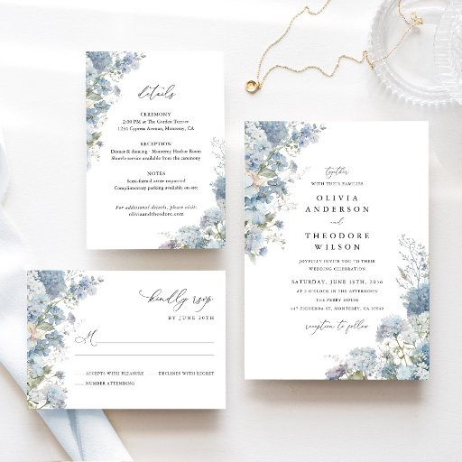blue white hydrangea wedding invitation