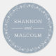 Modern dusty blue and white bride and groom name wedding envelope seals with a simple botanical wreath around the border. The minimalist design features a classic typography font for the names and a stylish calligraphy script for the centre text.