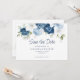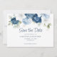 Elegant floral watercolor dusty blue, white, and navy floral bouquet wedding save the date card. The card features a modern script "Save the Date", that can be changed to a font type of your choice that are available here when you click the "Personalise" button.