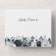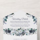 A 3 in 1 rustic floral wedding trifold invitation featuring a simple white background, elegant blue watercolor flowers, a wedding details card, wedding invite, and a rsvp meal option postcard for your guests to tear off and send back.