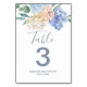This dusty blue florals table number card is perfect for a spring or summer wedding. The dainty design features light blue peonies arranged with peach and cream flowers in a gorgeous bouquet. The card prints on the front and back (double-sided). Add each table number that you need to your cart individually.