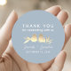 Elegant round wedding thank you sticker featuring two gold lovebirds on a soft dusty blue background with “Thank you for celebrating with us” above your names and wedding date. A beautiful finishing touch for sealing favour bags, gift boxes, or envelopes. Perfect for spring, summer, or early fall weddings with romantic, pastel, or bird-themed designs. Fully customisable to coordinate with your entire dusty blue and gold wedding suite.