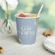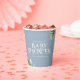 An elegant boy baby shower paper cup featuring chic typography and pretty botanical greenery foliage on a dusty blue background. Designed by Thisisnotme©