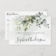 Design features a bouquet of watercolor greenery, eucalyptus and a succulent over a dusty blue watercolor splash. Design also features specks of painted (printed) gold and green.