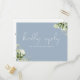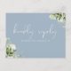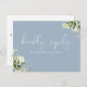 An elegant song request RSVP card featuring floral greenery and chic typography on a dusty blue background. The reverse features your details and a fun guest song request. Designed by Thisisnotme©