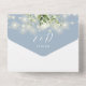 All in one dusty blue wedding invitation featuring botanical greenery, string lights and elegant typography. The invitation includes a perforated RSVP card with your wedding website QR code and details. Designed by Thisisnotme©