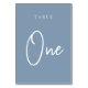 Simple and chic table number cards in dusty blue and white make an elegant statement at your wedding or event. Design features "table [number]" in an eyecatching mix of classic serif and handwritten script lettering. Design repeats on both sides. Individually numbered cards sold separately; order each table number individually from our collection.