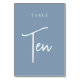 Simple and chic table number cards in Dusty Blue and white make an elegant statement at your wedding or event. Design features "table [number]" in an eyecatching mix of classic serif and handwritten script lettering. Design repeats on both sides. Individually numbered cards sold separately; order each table number individually from our collection.