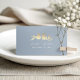 Romantic wedding place card featuring two gold foil look lovebirds on a dusty blue background. Elegant script font for names and date adds a soft, personal touch. Perfect for assigning reception seats with style and charm. Coordinates with the full Dusty Blue and Gold Lovebirds wedding suite for a cohesive event look. Easily customisable with guest names for a polished seating display.