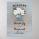 Dusty blue mason jar and white flowers rustic wedding welcome sign poster