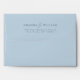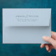 Elegant dusty blue wedding envelope featuring refined serif typography and a timeless monogram detail. The exterior includes the couple’s names and address in a clean, formal layout, while the inside flap showcases a minimalist A & W monogram for a cohesive, elevated presentation.