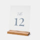 Modern, elegant table number acrylic sign features a minimalist dusty blue design featuring an elegant script font and classy serif font. Create as many table numbers as you need by changing the "12" to your desired number and add 1 item to your cart. Repeat for as many table numbers needed. The acrylic sign can be ordered with or without a wooden stand.