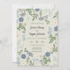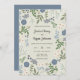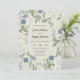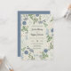 A wedding invitation featuring dusty blue flowers, leaves, and baby's breath.