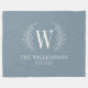 A pretty laurel leaf monogram decorates this dusty blue fleece blanket. Makes a great gift for a wedding or anniversary.