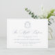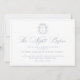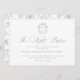 The Night Before. Dusty Blue Monogram Crest, wedding rehearsal dinner invitation. Vintage inspired Regency-Era baroque line art monogram crest. Features, an elegant dusty blue typography design style mix of script and bold type. Chinoiserie style garden floral pattern backing.