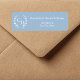 A dusty blue colored background. Decorated with a white wreath. Personalize and add your names, address and your first name initials. White text.