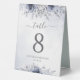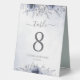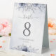 Elegant modern floral wedding table number tent sign featuring dusty blue watercolor flowers with handwritten calligraphy.