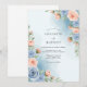 Soft watercolor washes in misty blue create an ethereal atmosphere for this romantic design. Delicate clusters of peach roses and sky blue blossoms are thoughtfully arranged with sage green foliage. The painterly style evokes a serene feeling, perfect for an elegant spring or summer wedding.
