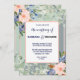 This stunning wedding invitation features a split background of dusty blue and light green with lovely flowers, eucalyptus greenery and a peach blush border. You might feel as though you were standing in a glorious garden. White lettering and touches of calligraphy are a perfect accompaniment to the beautiful flowers. A lovely design choice to set the tone for your wedding celebration. For any design question or additional customisation and / or matching items, just send an email to charmdesignstudio@rcn.com and we'll be delighted to assist. View the collection link on this page to see all of the matching items in this beautiful design.