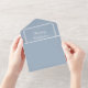 All-in-one wedding dusty blue invitation featuring elegant typography and monogram initials. The invitation includes a perforated RSVP with your wedding website QR code and details. Designed by Thisisnotme©
