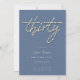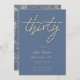 A glam, modern, elegant and chic 30th birthday party invitation template featuring a dusty blue background, the word thirty covered in rhinestones (simulated, not real stones, this is a digital effect), modern calligraphy script and typography in a pale shade of gold, with a gold and dusty blue marble back. A chic, timeless design for a woman on her thirtieth birthday.