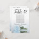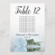 These beautiful table number cards will make it easy for your guests to find their seats at your wedding reception. They feature a simple yet elegant design with script calligraphy lettering and a single long-stemmed dusty blue or pale powder blue coloured rose lying on its side reflecting in water. The card includes a seating chart with 10 names. There is also space for the couple's names and wedding date. This card is available in a variety of sizes and is larger than our standard table number cards.