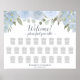 This wedding seating chart can accommodate 250 guests at 25 tables with 10 seats per table. It boasts a delightful bohemian-inspired design, adorned with rustic hand-painted watercolor roses, flowers, and blossoms in muted shades of dusty blue, complemented by sage green eucalyptus leaves and verdant garden foliage. The heading, "Welcome! Please find your table" is written in an elegant script calligraphy. The chart also includes space for the names of the couple and the date of the wedding. This seating chart is a fantastic way to welcome guests to your reception while ensuring that they can easily find their seats.