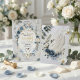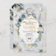 This design features a graceful illustration of a swan couple with detailed feathered wings, resting beneath an arch of dusty blue roses, navy florals , and sage green eucalyptus foliage. The artwork is set against a soft ivory and cream background with subtle gray marbling. A geometric frame surrounds the text, rendered in a muted faux gold tone to simulate a metallic shine. The typography combines an elegant handwritten calligraphy script for names with a traditional serif font for details.This is a flat printed image with a faux gold foil and marble effect, not actual raised metal or stone material.