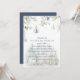 Modern Christmas party invitation featuring winter flowers and greenery in white, cream, dusty blue gray, and sage green with snowflakes and snow globe ornaments. The text is a handwritten calligraphy font in dusty blue gray. The back of the card is dusty blue gray with snowflakes. Personalize with your own information.